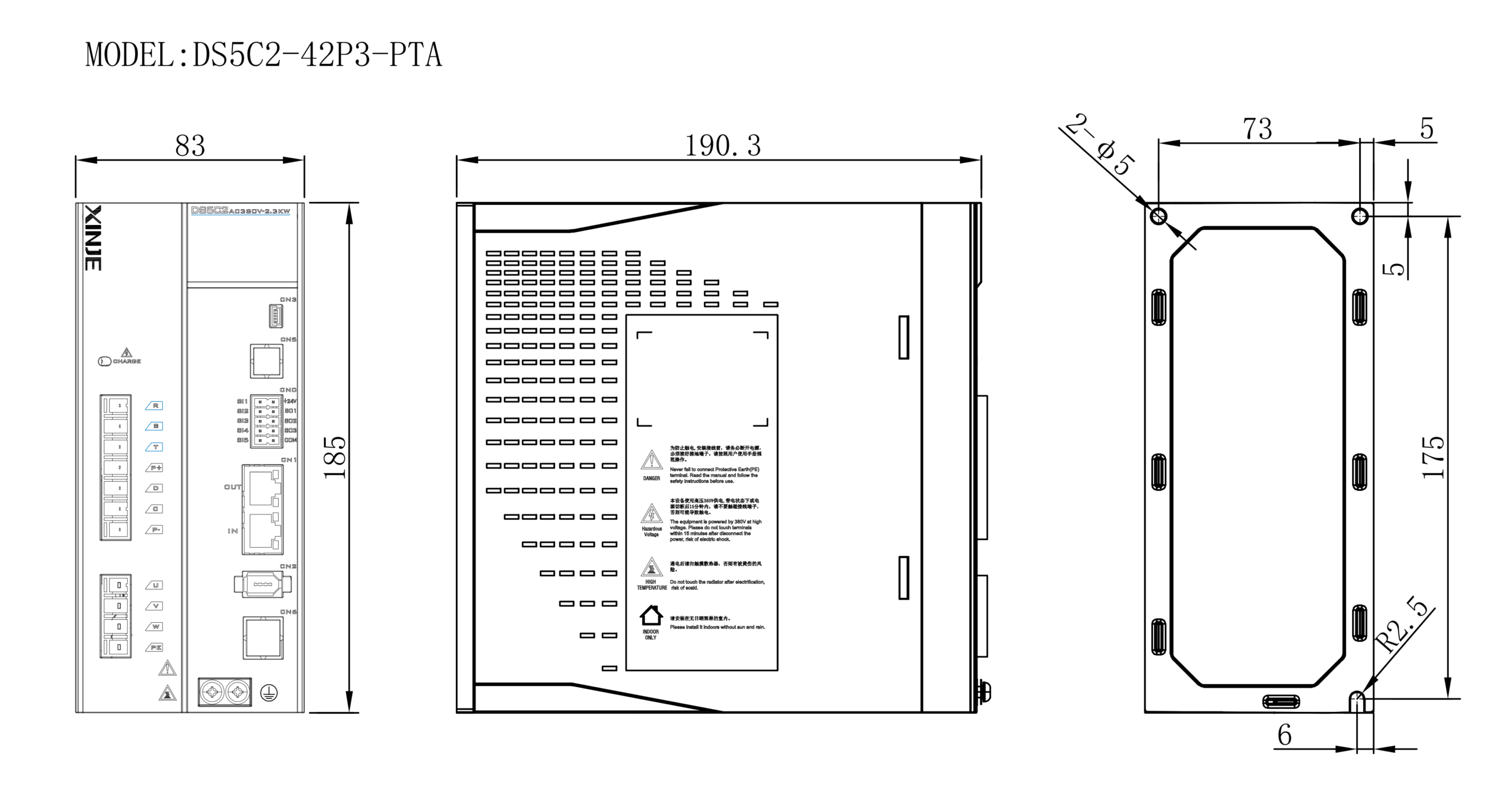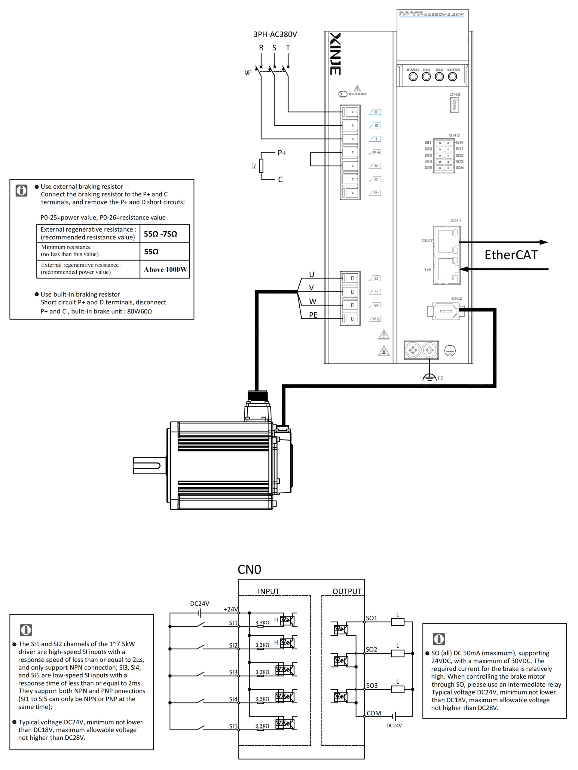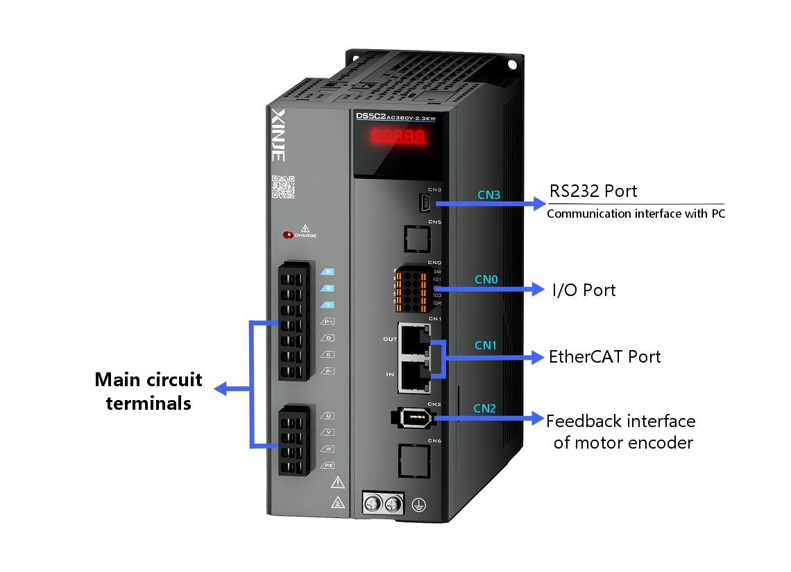 DS5C2 series EtherCAT bus type 2.3KW servo drive, with a power supply voltage of 3-phase AC380V, supports 5 DI and 3 DO, and supports three control modes: position control, speed control, and torque control.